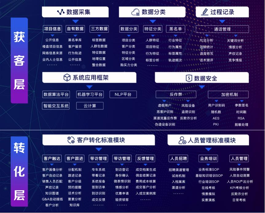 猎居科技拥有房地产行业集合自动化获客系统,从数据挖掘到智能潜客分发应用,再到线下真实的房产销售场景转化,能为房地产营销类企业提供高效的闭环式智能营销整体解决方案。