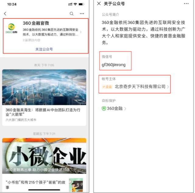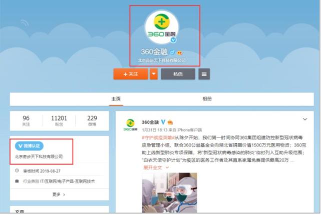 我们自查发现,天眼查信息虽与360金融官方观点有不同,但也并非凭空捏造或数据错误,而是审慎综合了工商信息及360金融自身对外发布的公开信息。我们发现,多个360金融官方账号的认证资料均显示其主体是北京奇步天下科技有限公司,包括但不限于新浪微博(见附图1),微信公众号(见附图2)。