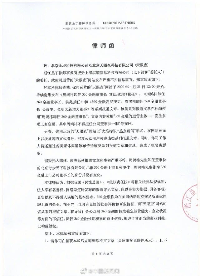 律师函显示,360金融方面称,由于天眼查从4月21日开始持续发布《周鸿祎卸任360金融董事长,其助理洪兆接任》以及《360金融高层变更:周鸿祎卸任360金服董事长,吴海生、金明义新增为董事》等系列报道文章,该类系列报道文章与事实严重不符。