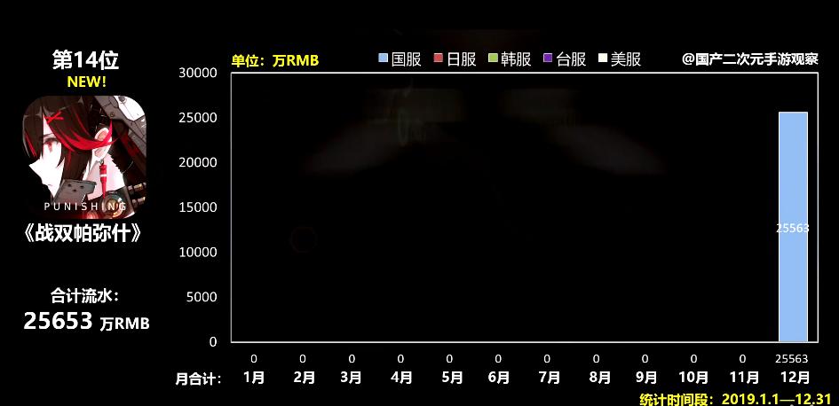 2019年年底最大的黑马《战双帕弥什》,即使在上线初期因运营问题遭遇波动,仍然只靠着最后一个月的营收来到二次元产品全年流水合计的第14位,流水达到25653万。
