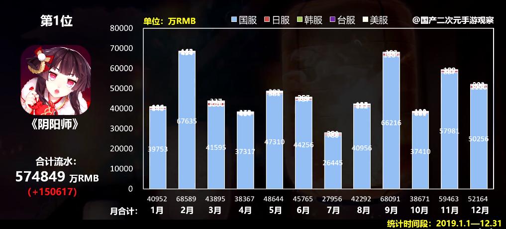 Square enix的这套路数成就了吃上螃蟹的那一批国产二次元手游,这其中就有一路吃香到今天的《阴阳师》,回看2019年的国产二次元手游营收表现,总是被玩家戏称为“在凉了”的《阴阳师》以574849万人民币的全年流水成为冠绝群雄的霸主,并且消费主力依然是国服(这帮人到底还在氪什么啊)。