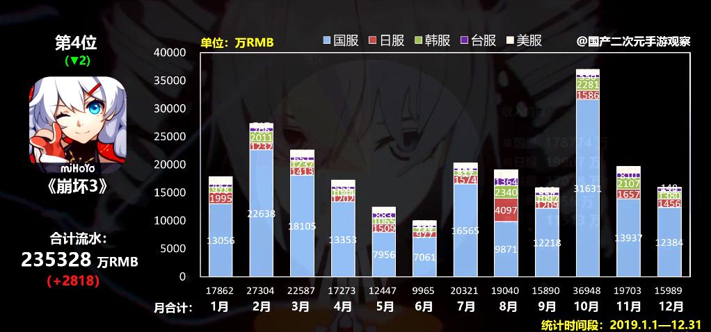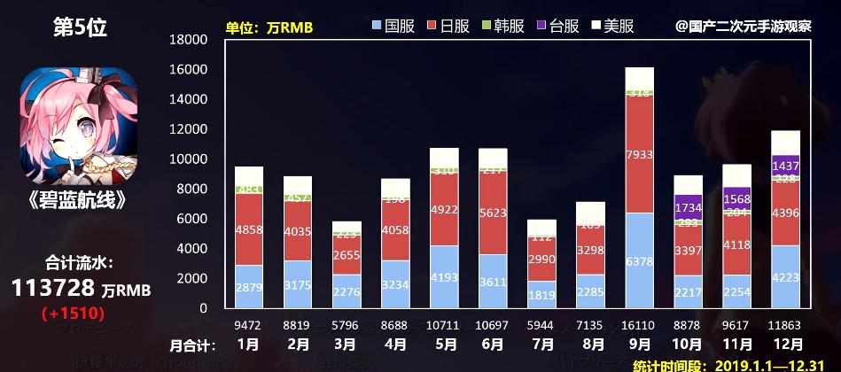 二次元品类同时也是国产游戏出海的重要参与者,如《碧蓝航线》2019年全年对日本市场的输出,观察它的流水构成,就能发现它在海外市场扮演的重要角色。