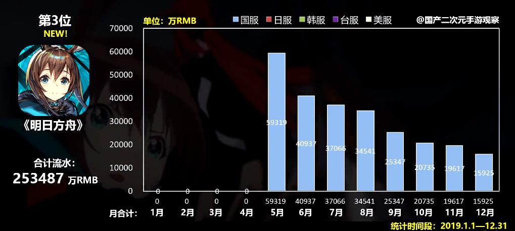 霸主的长寿不意味着挑战者的弱势,以鹰角为代表的新兴势力在2019年异军突起的表现值得注意,2019年的年度游戏《明日方舟》,在缺席4个月的前提下,以高于《崩坏3》的总流水代表了2019年二次元品类的爆发。当然像它的诸多前辈一样,粘性较弱,仰赖更新的模式让它很早地就进入了人气起伏的循环,遗憾错过了此次TOP10的“二次元会师”。