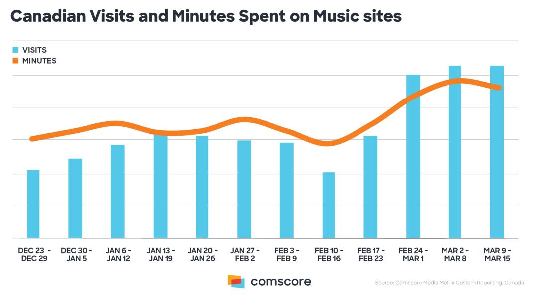 图注:疫情期间加拿大音乐网站访问量的增长曲线(来源:comscore)