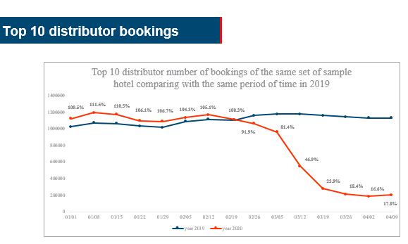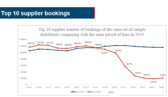 3月25日以后,全球酒店分销商和供应商的订单量都基本稳定在20万左右,仅为去年同期的20%不到。4月8日全球10大酒店供应商的订单量,4月9日全球10大酒店分销商的订单量,都比同期减少了82.8%。