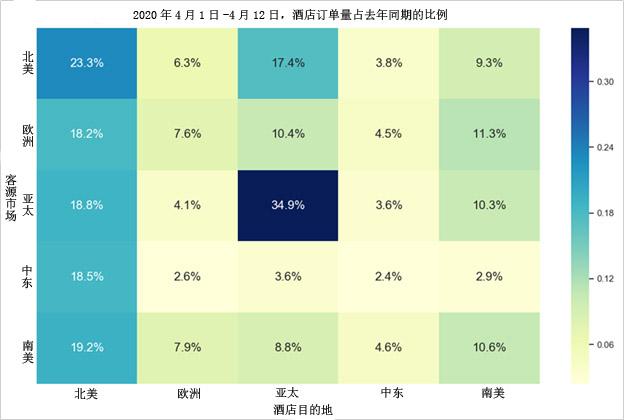 全球酒店分销技术服务商德比软件数据显示,在4月的前12天,全球客源市场出发到不同目的地的酒店订单量与去年同期相比,亚太地区客人预订亚太地区酒店的比例最高,为去年同期的34.9%。北美作为目的地,来自南美、中东、亚太、欧洲和北美的客人的订单量都在去年同期的18%以上。其他地区则普遍不足去年同期的10%。