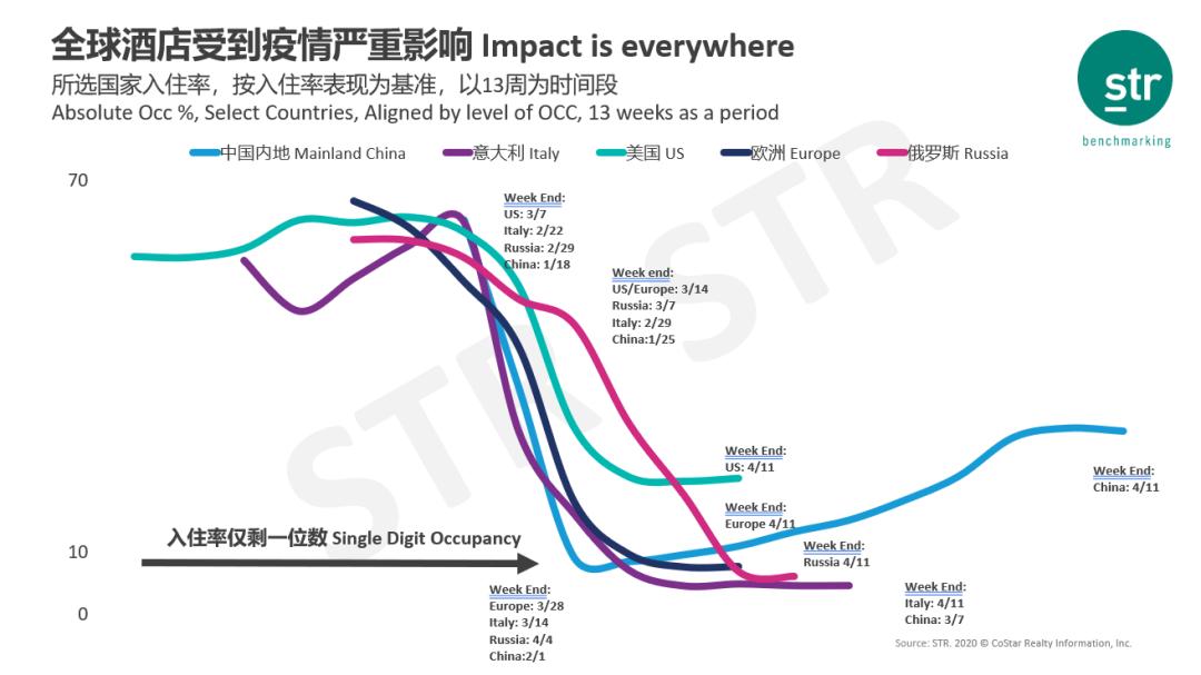 其外,意大利从3月10日全面封国,STR的历史趋势图显示,意大利酒店的入住率在3月14日跌到谷底。俄罗斯从3月30日开始封国,STR的历史趋势图显示,俄罗斯酒店的入住率在4月4日跌到谷底。可见,疫情蔓延、封国封城以及经济衰退都对酒店入住率带来巨大冲击。