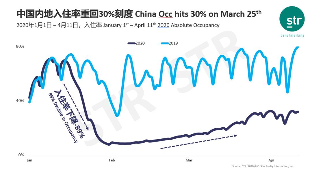 而今年,1月的前半个月仍呈上升趋势,但1月中旬达到最高点后便一路骤降,2月1日达到最低的7%,期间,正是新冠疫情在国内爆发的关键时期。2月开始,伴随着非疫情城市的复工复产,酒店入住率缓慢回升,但和去年同期仍有较大差距。直至3月25日,中国内地酒店入住率冲破30%。4月1日至4月11日期间,中国内地酒店入住率基本在20%-40%之间波动。