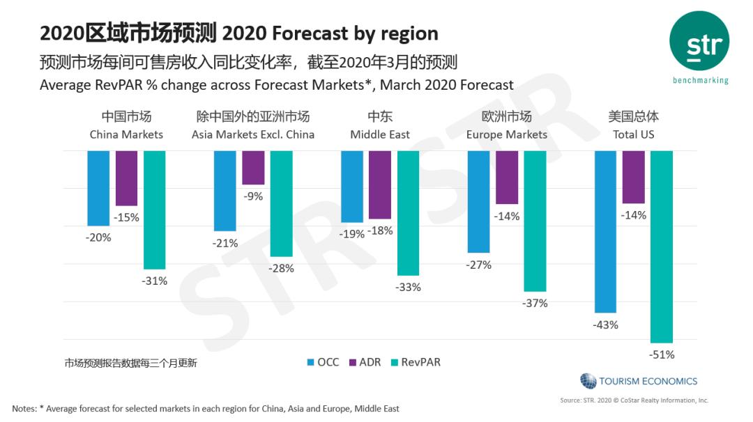 截止至2020年3月,STR对2020年全球部分区域市场做出了一些预测。其中,中国市场(基于北上广、成都和杭州酒店市场预测数据)的酒店入住率将下降20%,ADR下降15%,RevPAR下降31%。目前累计确诊病例最多的美国预测入住率将下降43%,ADR下降14%,RevPAR下降51%。