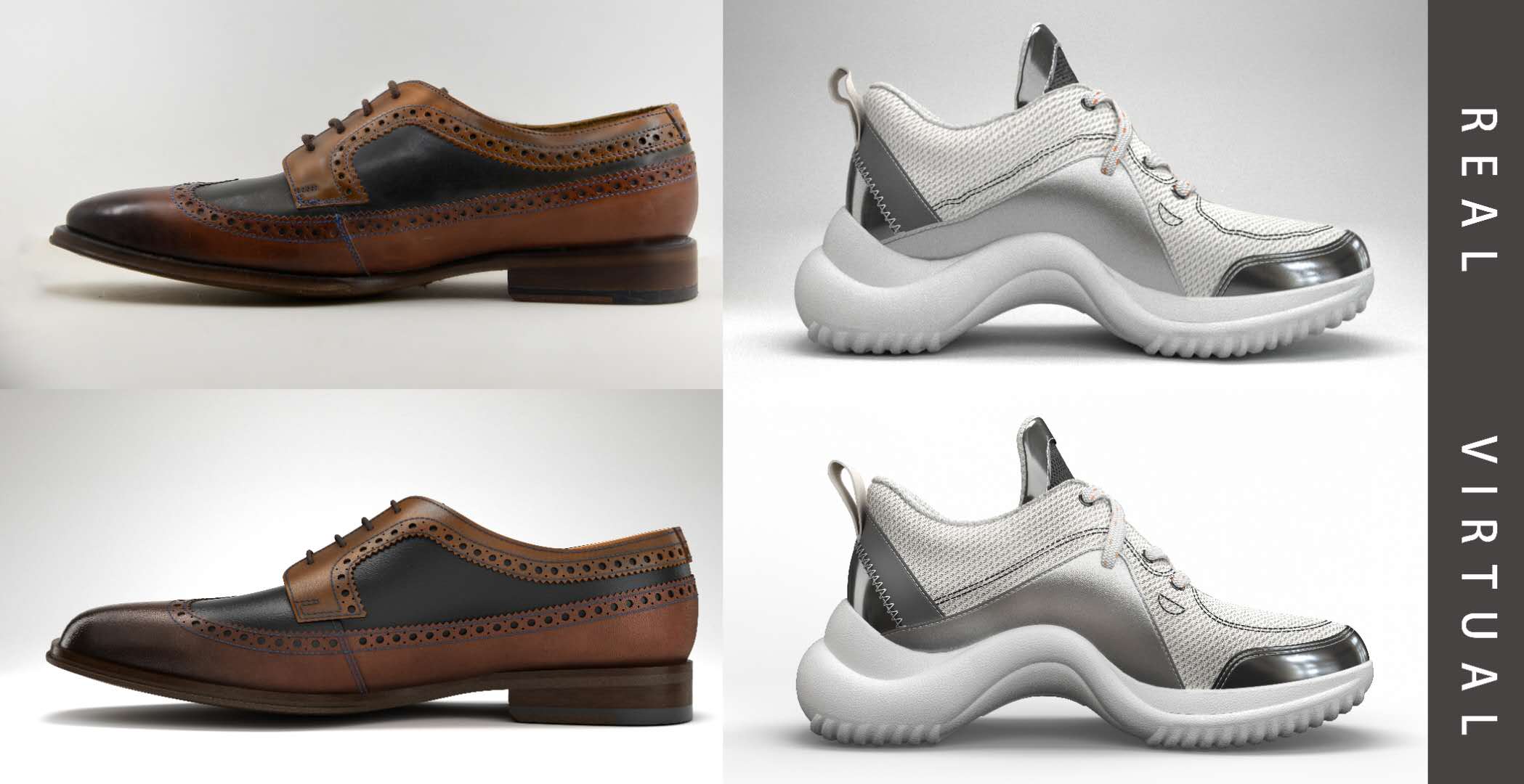但想要虚拟样品的逻辑能够行之有效并被客户接受,对鞋类设计、质感的还原度要求非常高,需要能够真正实现"所见即所得"。关于时谛智能的实际还原效果,我们可以参考以下运动鞋和皮鞋的对比图(上为实拍图,下为3D虚拟设计图)。而要实现这一效果,不需要设计师进行专业渲染知识的学习,在平台通稿拖拽素材便可实现一键出图。