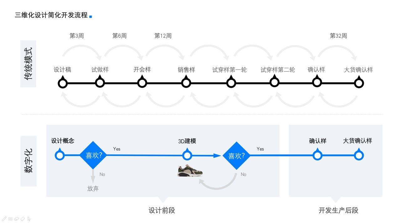 但回归降本增效这一根本目的,在线协同作业在鞋类的设计与生产过程中,更有发挥空间,因为鞋类不仅设计生产成本更高,且生产周期也更长。据了解,一款鞋从设计稿到确认生产制成鞋子的总成本可高达万元,一双鞋从设计到上架全周期需要耗时8-12个月,而服装品类则平均是3-6个月。