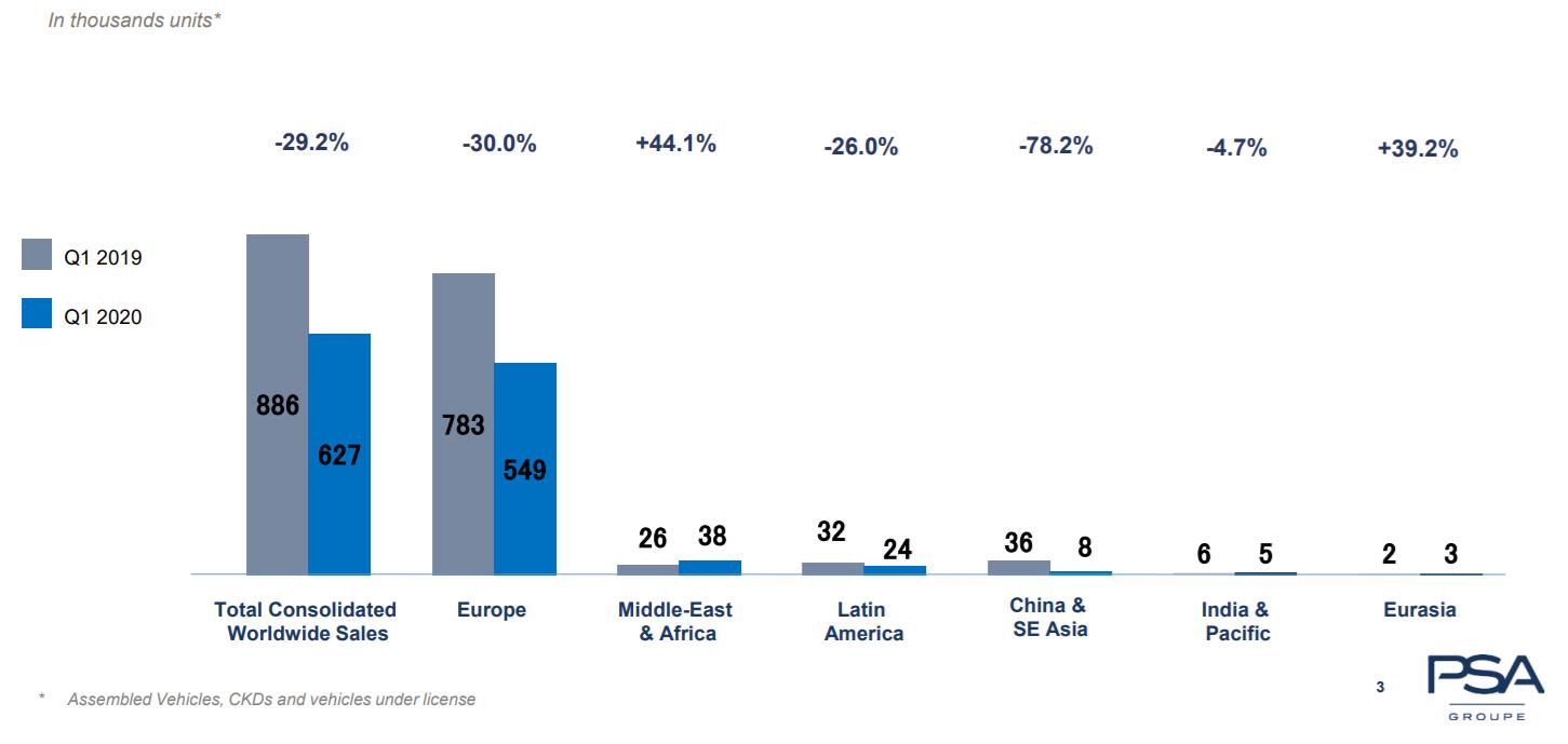 4月21日,标致雪铁龙集团(PSA)宣布其一季度营收为151.79亿欧元,同比下滑15.6%。PSA集团还对2020年营收做出了悲观的估计:欧洲市场下滑25%、中国下滑10%、拉美下滑25%、俄罗斯下滑20%。