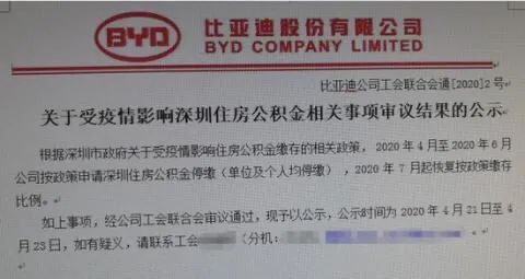 值得注意的是,4月21日,一张带有比亚迪公司抬头的《关于受疫情影响深圳住房公积金相关事项审议结果的公示》文件图片在网上流传。图片显示,受疫情影响,比亚迪公司决定于2020年4月至2020年6月对深圳住房公积金进行停缴,2020年7月起恢复按政策缴存比例。