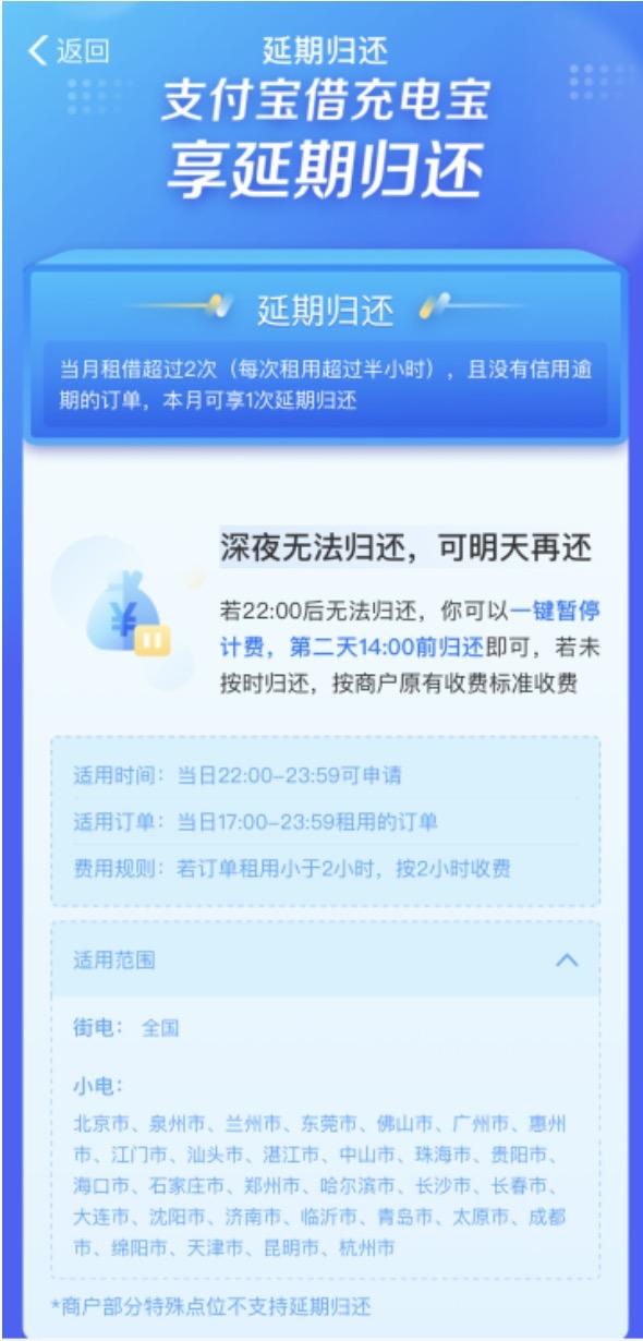 记者体验了下,上支付宝里搜“充电宝”就能找到“延期归还”服务。具体而言,当日17点后的订单,可以在22点到24点间提出申请,一键暂停计费,在第二天14点前归还即可。据悉,使用这一服务需要当月租借超过2次,每次超过半小时,且没有信用逾期订单,每人每月都能使用1次。