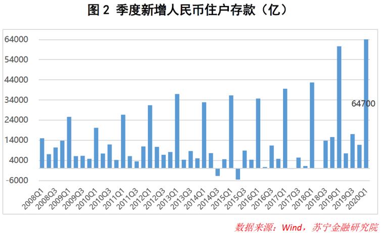 从绝对量来看,2020年一季度人民币新增存款创下新高,增速也比去年同期提升。从这两个数据可以看出,一是存款基础雄厚,这是未来消费的最大保证,也是经济增长的最大保障;二是在收入下降的情况下,同比的存款增速却提升了。从这方面来看,“报复性存款”的提法并不妥(见图1)。