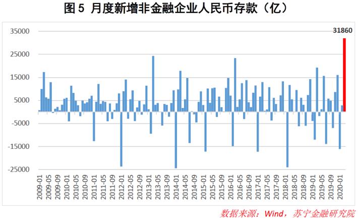 非金融企业存款方面,今年增加1.86万亿元,去年同期增加3328亿元,同比多增长1.53万亿元,贡献了同比多增存款1.76万亿中的87%。月度来看,3月份新增企业存款创下历史新高,达到3.2万亿元(见图5)。