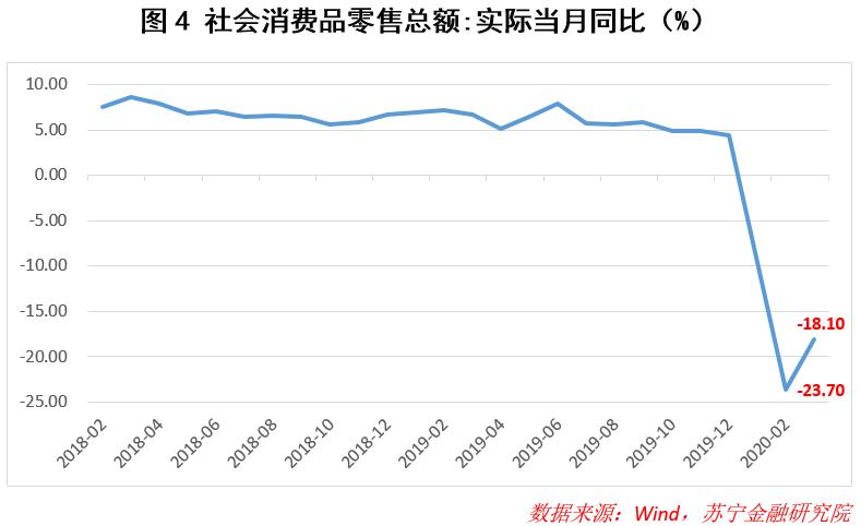 四是疫情使人们减少了消费,并唤醒了居民的危机意识,在投资、消费、储蓄的选择中,将更多的资金倾向于储蓄,以更好的应对未来的不确定性,代表居民消费的社会消费品零售总额大幅下跌(见图4)。