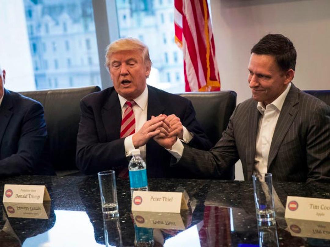 2016年12月14日,当选总统的Trump在纽约市的特朗普大厦与Peter Thiel握手。