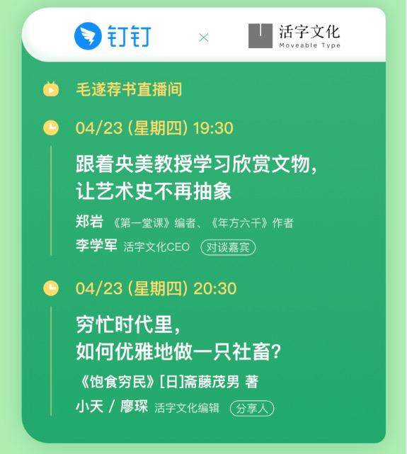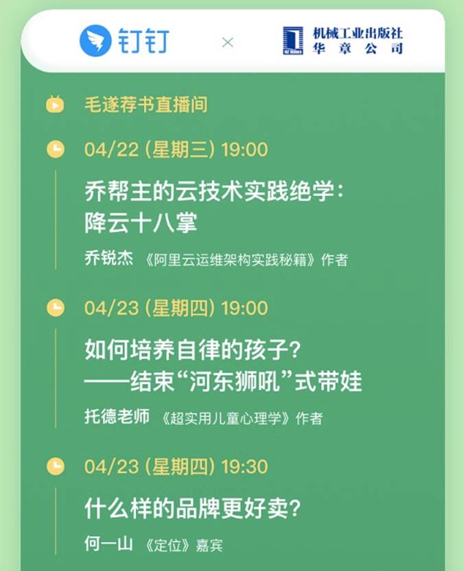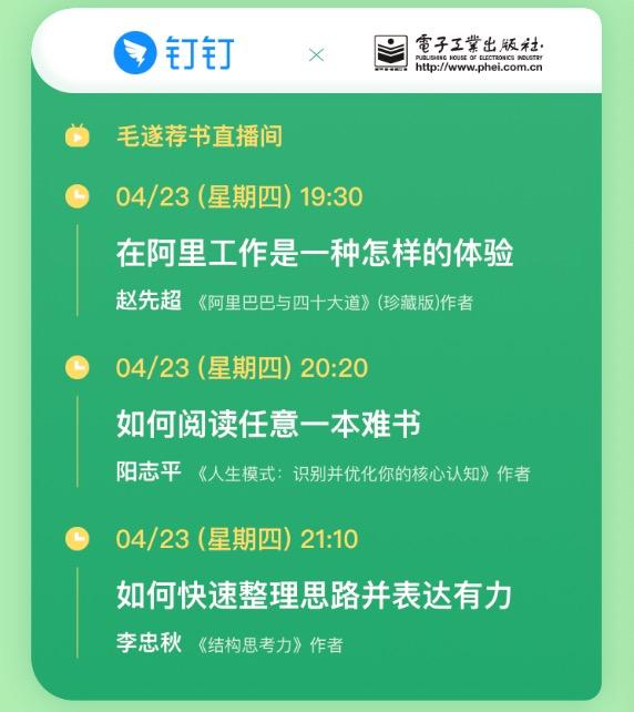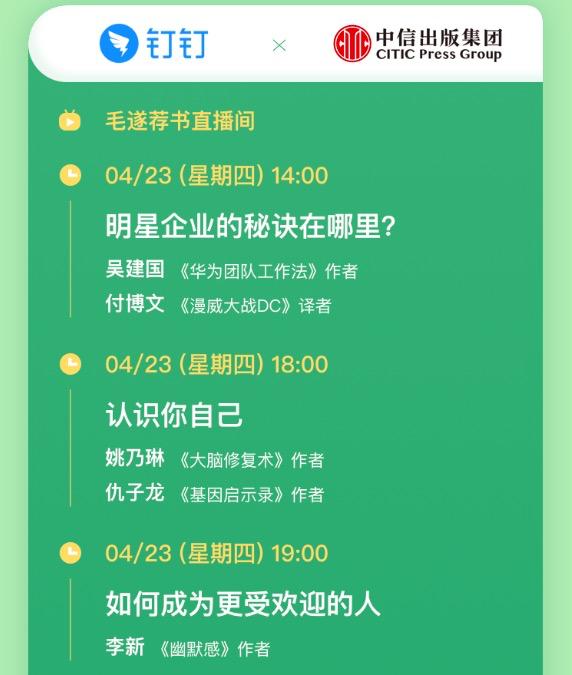 鉴于此,钉钉联合天猫图书、电子工业出版社、中信出版集团、活字文化、机械工业出版社华章公司等相关机构以及众多读书圈主,开启首届圈子读书节,邀请知名作者、学者、编辑进行十多场高质量读书直播分享,并为读者推荐必看的书单。