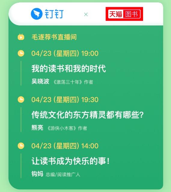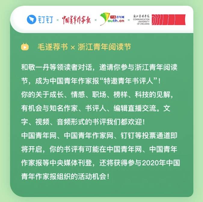 同期,钉钉联合中国青年作家报、中国青年网、浙江传媒学院,启动“毛遂荐书×浙江青年阅读节”,围绕成长、情感、职场、榜样、科技5个阅读主题,邀请作家、书评人、编辑进行讲书、领读直播活动,读者可以和包括鲁迅文学奖获得者沈苇在内的众多领读者交流对话。