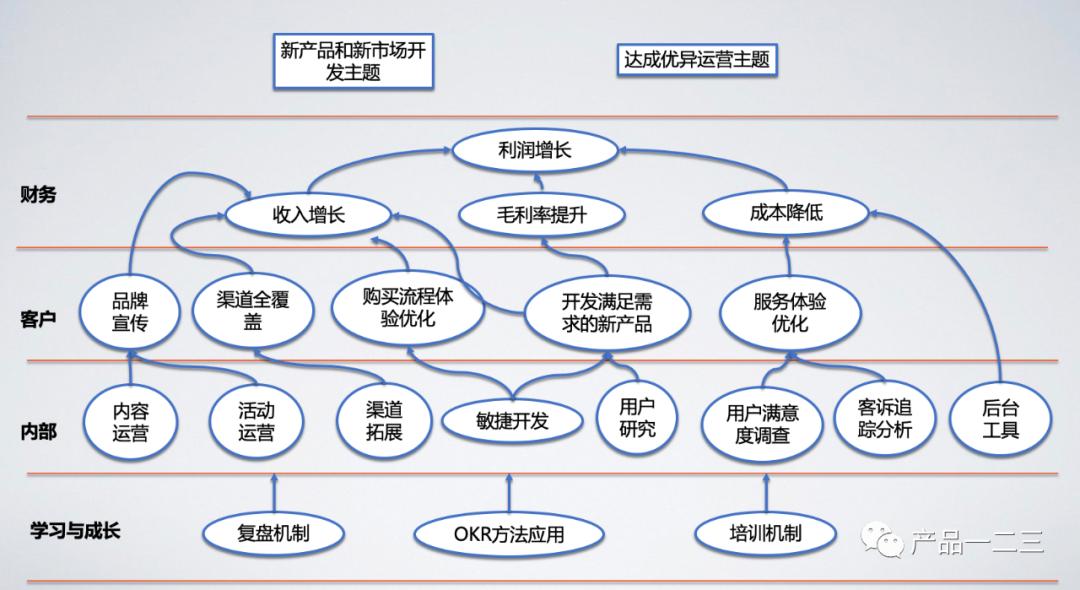 3.各层之间的要素要有因果关系,可以展示战略主题实现过程中的因果关系,帮助团队成员对战略全局有直观、生动的理解,了解各自对于整体战略的贡献