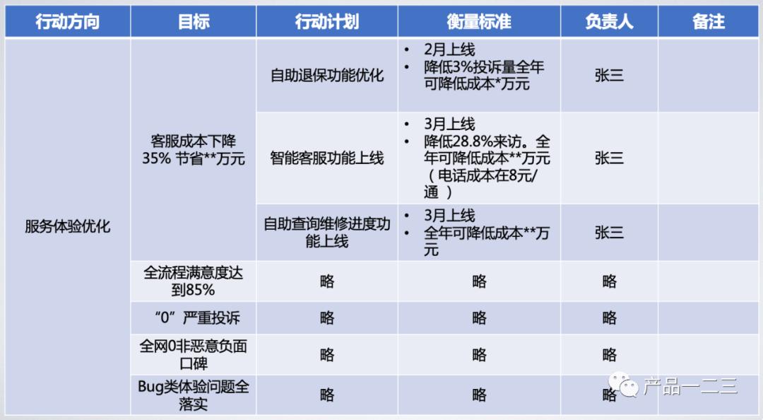 另外选取“服务体验优化”主题向下分解,形成以下的行动计划表