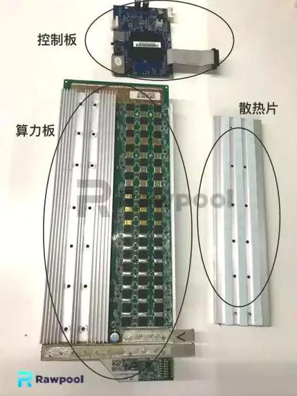 散热片和风扇,构成了矿机的散热系统,防止矿机芯片因为高速运行、温度过热而烧坏。