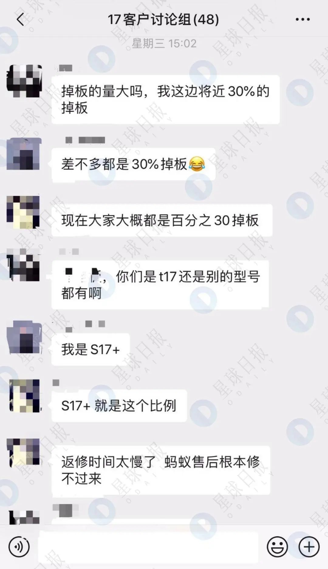 部分群员自曝,其购买的“17”系列矿机(包括 S17+、T17 等型号),数量从几百台到数千台不等,坏损率高达 20%-30%。故障原因集中于两点,一是散热片松动或移位导致算力板短路停摆(也即截图中所说的“掉板”)、继而让矿机算力大幅下降,二是电源风扇故障、进而导致电源停摆。