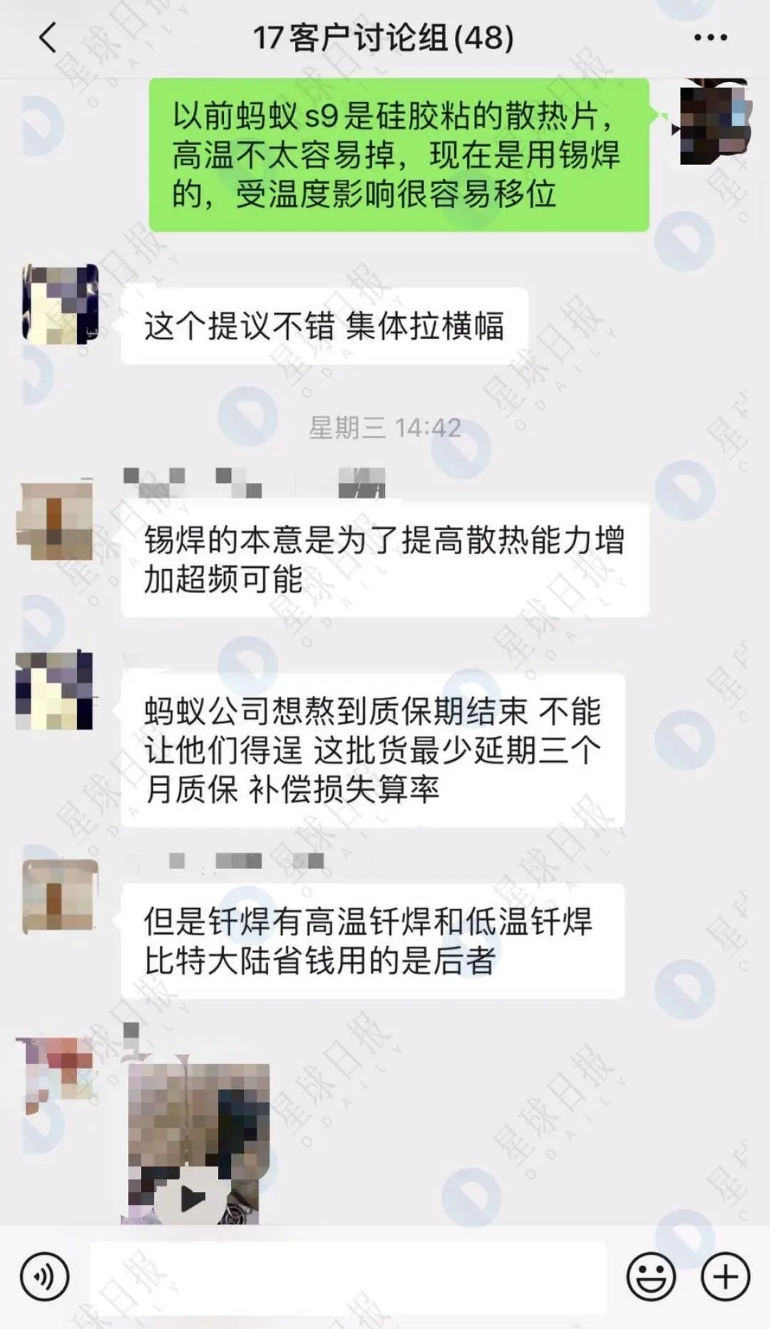 “二来,群里有些人是矿场主,出问题的是客户的矿机,但他也得了解是怎么回事、好向客户交代。但具体怎么维权,恐怕要客户自己去想了。我们这种级别的矿工,在朋友圈控诉后,大陆的相关高管愿意拉群聊聊,其他散户恐怕连这个机会都没有。”
