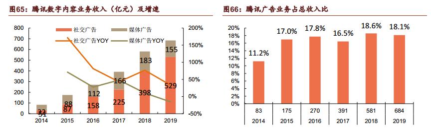 社交广告,主要包括朋友圈、除腾讯新闻外的移动端新闻应用、微信公众号等APP的信息流广告收入;媒体广告,主要包括腾讯视频+腾讯新闻的贴片广告+信息流广告收入。
