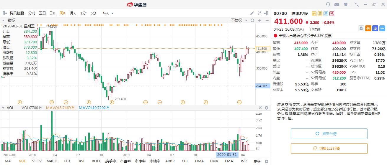 在2014年腾讯的股份曾经进行一拆五的操作,截至4月23日股价411左右水平,腾讯在近16年股价涨幅接近555倍!