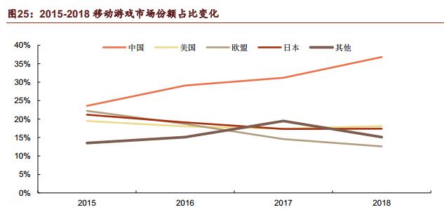中国在移动游戏中的份额,从2015年的24%提升到2018年的37%,相比之下,美国从20%下降到18%,欧盟从22%下降到13%,日本从21%下降到17%。2015-2018年,中国移动游戏市场规模年复合增长率为40%,同期美国、欧盟、日本分别为18%、0%、13%。