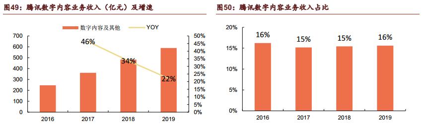2017-2019年腾讯数字内容业务收入分别是361/482/589亿元,增速分别是46.3%/33.7%/22.1%,2019年数字内容服务收入占总收入的16%,过去四年占比稳定,业务增速与公司营收整体增速相匹配。