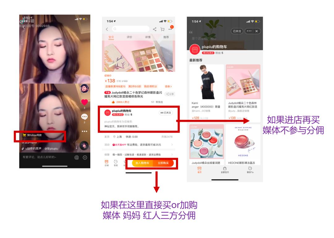 然后店主可以将这些商品的对外推广链接,外挂在抖音、快手、微博、B站中,比如挂靠在抖音的橱窗内。但是,用户通过商品页购买或者加购才能获得佣金,如果是直接通过店铺内购买,则媒体机构是不参与分佣的。