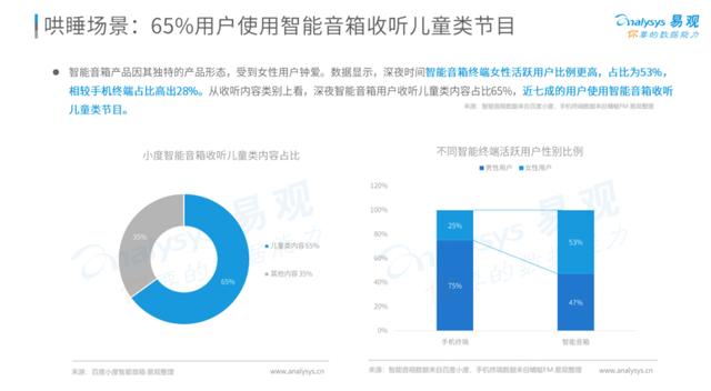最近易观发布的《2020中国夜听经济发展分析》显示,随着移动互联网的发展和 IoT智能终端的普及,适应于语音交互形式的音频内容在智能家居、可穿戴、车联网终端所开辟的家居等场景中被更多地收听,从收听内容类别上看,深夜智能音箱用户收听儿童类内容占比65%,近七成的用户使用智能音箱收听儿童类节目。在智能设备的普及过程中,音频收听开始成为人们不可或缺的一部分。