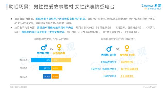 如果一个内容创作者,没有公众号创作的文笔,没有视频节目制作的设备,并不意味着Ta不会是一个好的音频节目创作者。相比于其他的内容形式,音频节目收听的场景化特性较为明显,最近易观发布的《2020中国夜听经济发展分析》显示,2019年,在线娱乐产品在20:00的活跃用户数超6亿,音频行业夜听用户规模达2.17亿。而在21:00后,移动音频用户持续活跃,用户夜间使用时长高于多数在线娱乐平台。