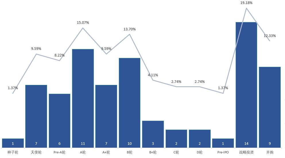 从融资轮次看,项目集中在早期项目和战略投资,其中战略投资达到14笔,而天使轮和A轮融资分别达到7笔和11笔,相较上周而言战略投资和早期项目的比重下调,中后期项目得到关注。