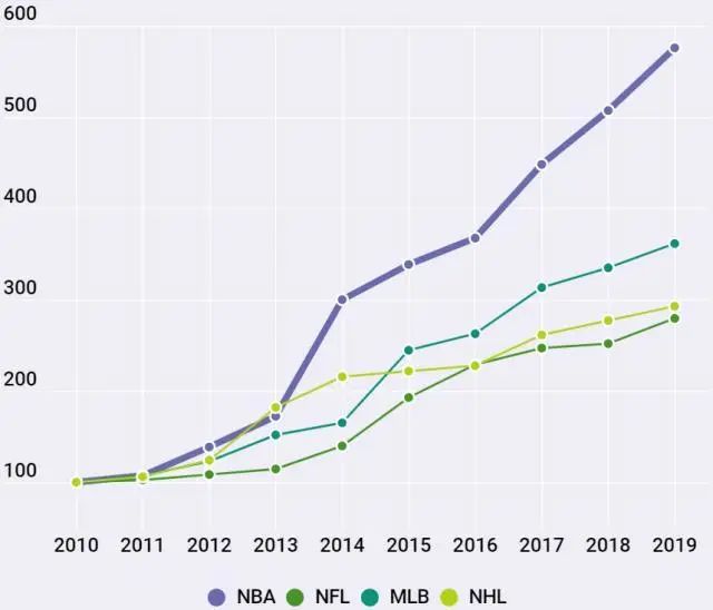 过去10年,北美四大联盟球队的平均价值水涨船高(图源:福布斯)