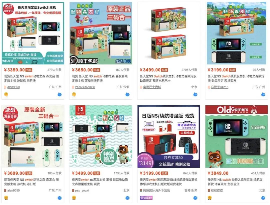 淘宝的情况也差不多。如果你以「Switch」为关键字进行搜索,大部分店家都会给出 3100-3500 元左右的定价;如果是动森限定机这类热门款式,更是能开价 4000 元。