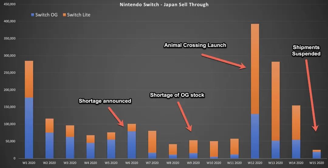 日本的情况为例,2 月底任天堂发出预警,原版 Switch 销量开始大幅下降,但当时还有 Switch Lite 支撑;之后等到动森游戏上市,再次推高了两个版本的 Switch 销量,但也因供给无法及时跟进,任天堂在 4 月初暂停向日本本土出货,一周后才恢复。