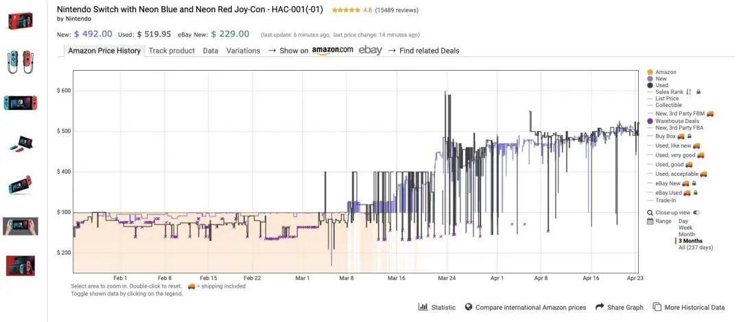 3 月份起,美亚上就很难再买到直营的全新 Switch 了,大部分报价都在 500 美元左右,动森同捆机更是可以卖到 750 美元,基本都是原价的两倍多。