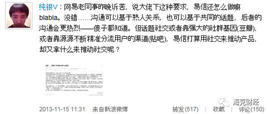 在同年11月由网易前员工、网易相册前产品经理郭子威(纯银)在新浪微博曝光的一封被指来自丁磊的内部邮件中,丁磊对移动社交产品的开发思路给出了自己的判断,同时对当时的微信、陌陌、易信、来往分别做了点评,他说,“现在的几个同类产品,微信5分,陌陌4分,我们0分,来往负分。接下来你们给我看的东西,最少要到6分”;他同时说,“做一款大产品,眼光也要更大一点”。