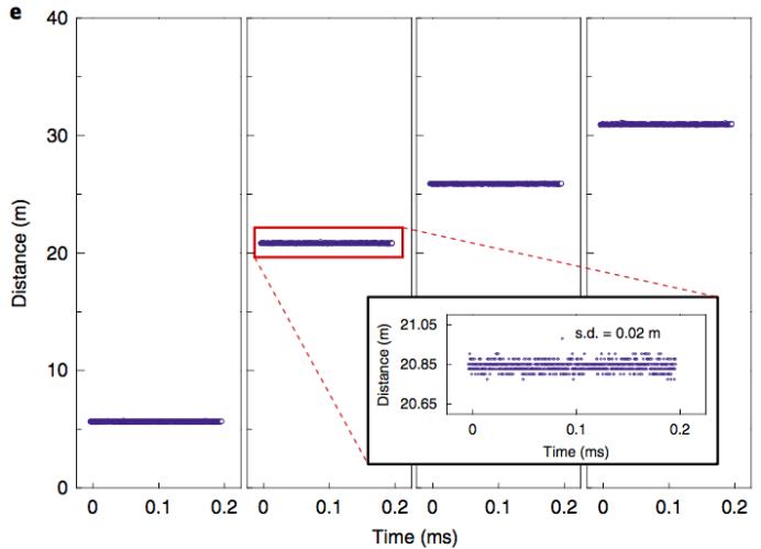 距离与时间的关系图,其中时间增量是参考脉冲周期,显示距离测量的稳定性