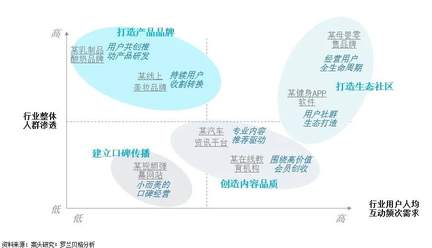 这八家企业具体采取的用户经营策略,其关键致胜要素又呈现显著行业特性。高行业渗透、相对低用户互动频次的行业,用户经营的核心是对产品品牌的打造;高行业渗透、高用户互动频次的行业关键在于搭建社区、打造生态;低行业渗透、相对低用户互动频次行业的关键在于创建口碑,加速传播;低行业渗透、高用户互动频次行业的关键则在于创造内容品质。