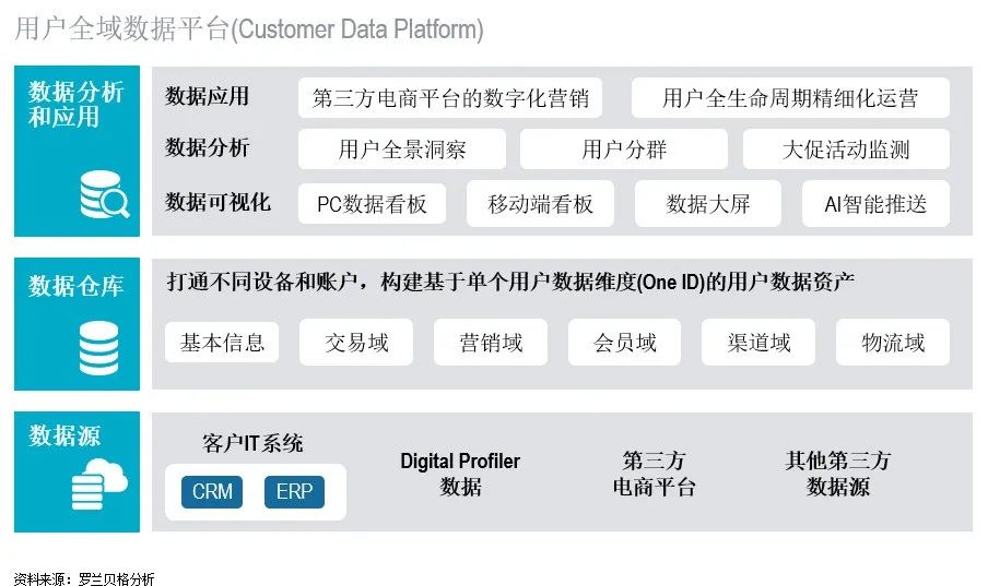 CDP平台的部署对企业的发展具有战略意义。以消费者为主线的商业模式思考过程势必要求企业充分理解用户,这离不开数据的支持。企业需战略性布局自身数据资产,其核心在于建立自有数据能力。CDP平台结合内外部数据,建立全域数据库——这将赋予企业对目标用户的理解和把握能力。