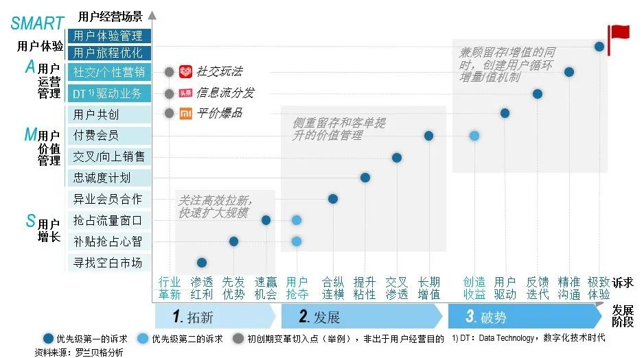> 破势期企业:这一阶段企业已经占据行业一定的地位或市场份额,如何实现进一步的突破,将需要更进一步回归到用户为本的理念模式,通过持续用户运营和用户价值管理,来探寻企业增长突破点。