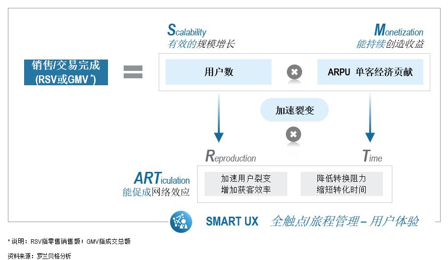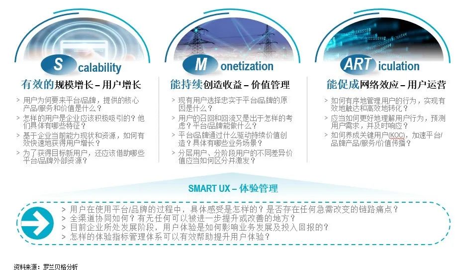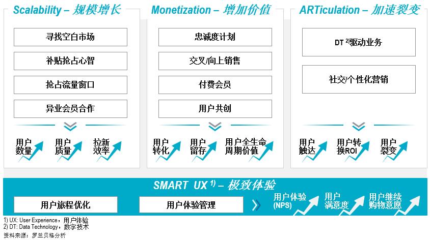 基于上述讨论,本文提出SMART用户经营模型,将围绕用户的管理逻辑拆解为四大关键命题:用户规模增长(Scalability)、用户价值管理(Monetization)、用户运营管理(ARTiculation)、用户极致体验(SMART UX)。