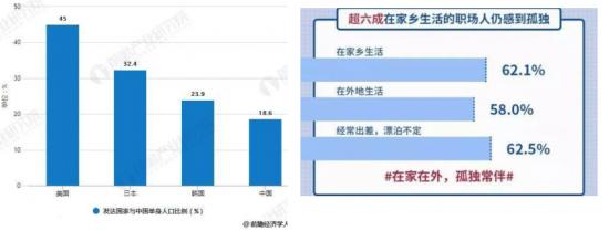 再观发达国家,美国的单身人口占其人口45%,日本32.4%,韩国23.9%。如果按亚洲这两国单身人数比例,未来中国单身人口可能突破4亿。社会前进越快,便有如登山,高处不胜寒,孤独感更加如影随形。更有统计显示,超六成在家乡生活的职场人仍感到孤独。