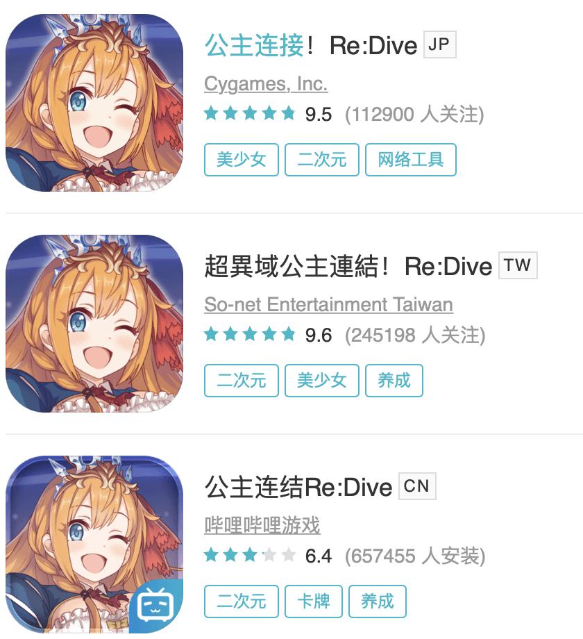 作为一款二次元手游,《公主连结》的初期氪金量非常好,但随之而来的就是大规模的差评和玩家流失。在手游评分网站TapTap上可以看到,在日服和繁中服都是9.5的高分下,简中服的6.5显得格外刺眼,并且很多评论都是抱怨抽卡体验和游戏机制。