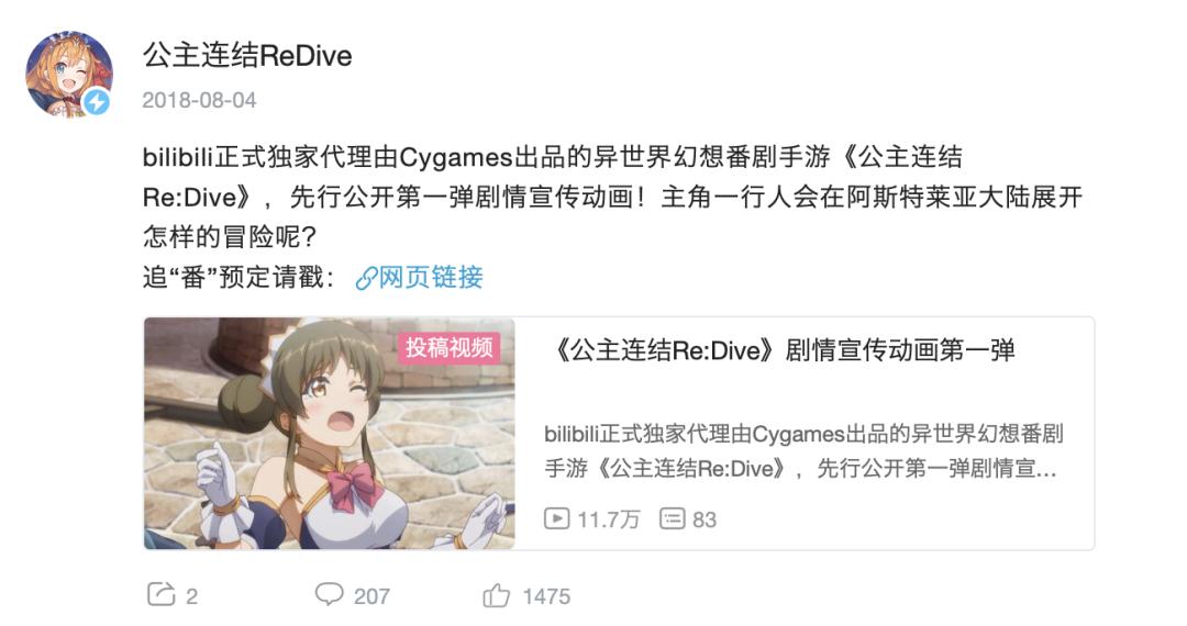 所以,我们看到了这一个月以来公主连接铺天盖地的宣发。如果你逛B站、游戏攻略论坛和贴吧等社区,你一定会看到公主连接的广告。就连微博和抖音,B站也花了大力气去推广,而动画的同期播出也起到了很好的宣传效果。